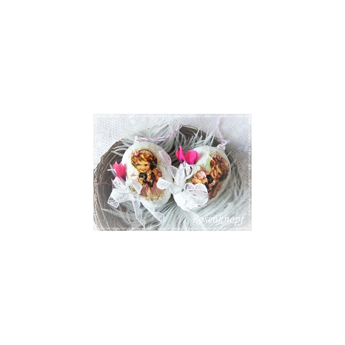 Die Ostereier wurden mit einem nostalgischen Bild in Decopage Art, zwei Blüten in Malve und einer Spitzenschlaufe verziert.