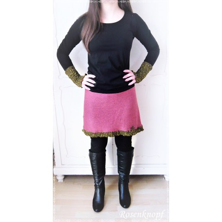 lll➤ Knielanger Rock aus leicht meliertem Strickstoff in dunklem Altrosa mit Anthrazit in leichter A-Linie mit Jerseybund in Schwarz.