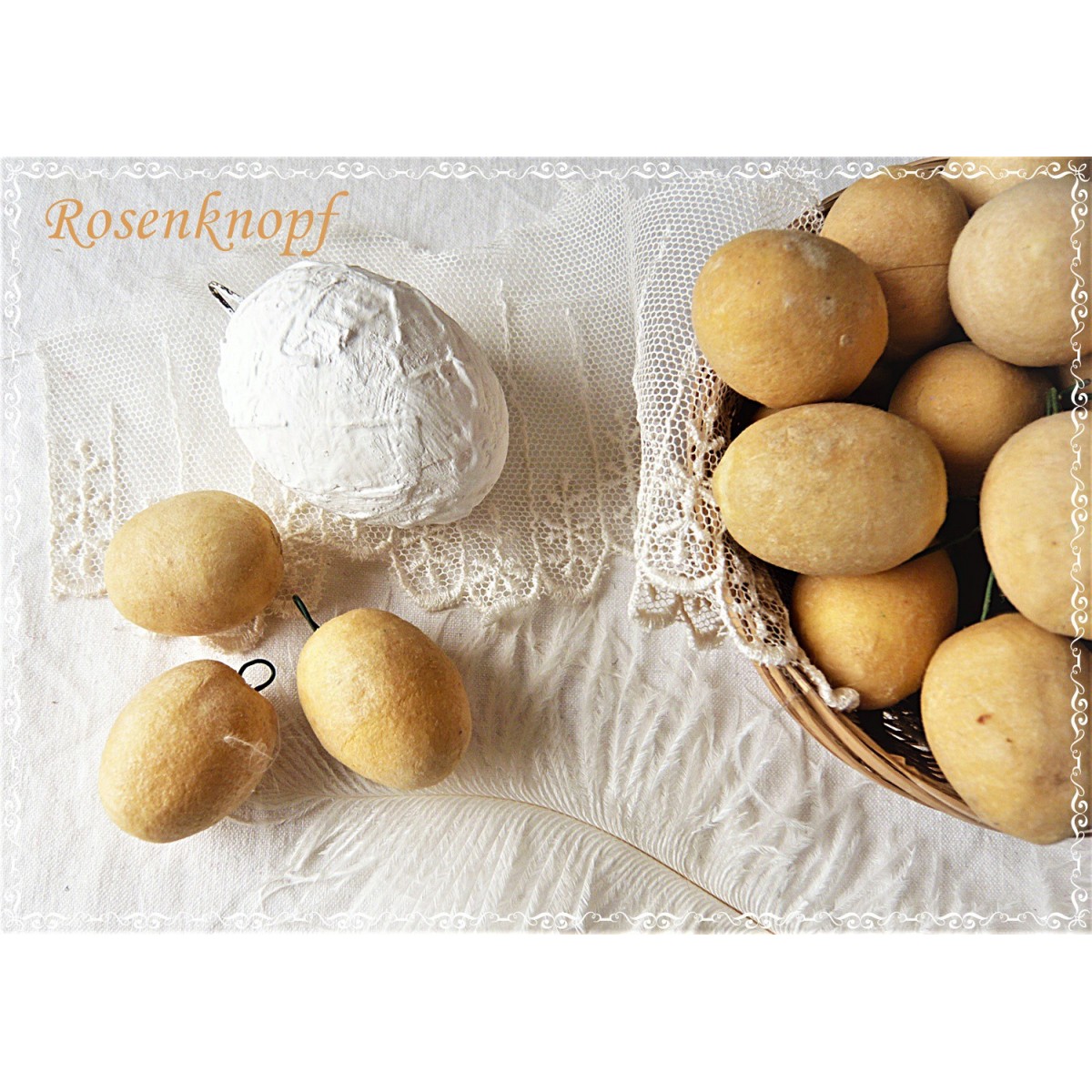 Die zart ockerfarbenen Eier stammen aus dem Konvolut eines Bastelladens, sind aus den 1980ger Jahren und passen auch schön zum Shabby- und Vintage Stil.