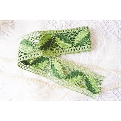 Zur Verfügung steht ein knapper Meter (98cm) Vintage Klöppelspitze in Dunkelgrün und Grün. Das Muster zeigt aneinandergereihte Blätter und Rand mit Löchern. Vielfältig zu verwenden für Vorhänge, Kissen, zur Dekoration, für Tischdecken oder Puppenkleider......etc.