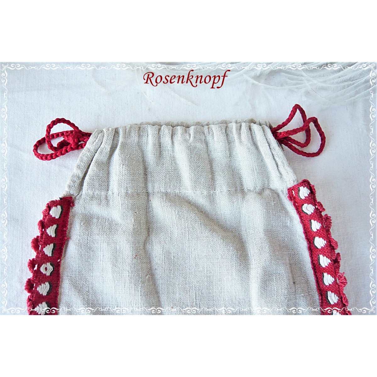 Den Rand des Stoffbeutels schmückt eine rote Borte mit kleinen weißen Dreiecken.