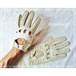 Tolle Cabrio Lederhandschuhe in hellem Beige für den maskulinen Mann. In den 1960ger Jahren war Mann erst richtig hipp, wenn er beim Autofahren Lederhandschuhe á la James Dean trug. Die Lederhandschuhe stammen aus dem Konvolut einer Lederfabrik, sind ungetragen und in einem neuwertigen Zustand.