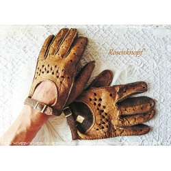 Edle Vintage Cabrio Lederhandschuhe in hellem Beige und Mokka für den maskulinen Mann. In den 1960ger Jahren war Mann erst richtig hipp, wenn er beim Autofahren Fingerhandschuhe á la James Dean trug. Diese hier wurden aus edlem Pfauenleder hergestellt, haben ein Lochmuster und können am Handgelenk oben mit einem Druckknopf geschlossen werden.