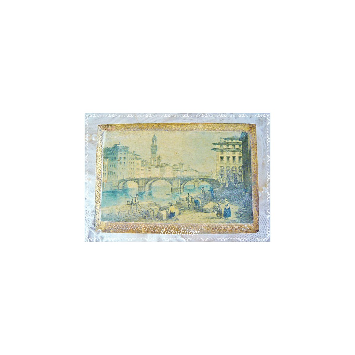 Als Bilderrahmen und an allen Kanten wurde die Box mit goldener und rötlich schimmernder Farbe bemalt.