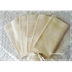 Traumhaft schöne Stoffservietten in Ivory aus den 1930-1940ger Jahren die noch nie in Gebrauch waren absolut neuwertig sind. Sie bestechen durch ihre wunderschöne Hohlsaumstickerei in beigefarbenem Garn. Wenn bei Tisch auf Stil und Eleganz nicht verzichtet werden möchte, ist dieses 5tlg.Textilservietten Set für die stilvolle Kaffeetafel ein absolutes...