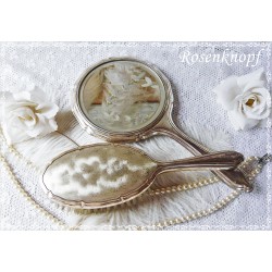 Wunderschönes und gut erhaltenes Boudoir-Set aus der Zeit um 1920-1930. Das Frisierset besteht aus einem Handspiegel und einer Haarbürste mit versilberter Oberfläche. Beide Teile des Frisiertischsets sind gut erhalten, weisen jedoch kleine Abriebspuren und Anlaufstellen auf. Der Spiegel ist recht schwer.