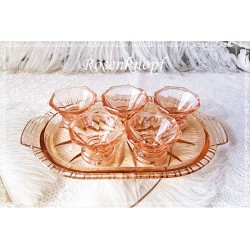 Sehr dekoratives Vintage Glas Set aus zartem Rosalinglas, gefertigt um 1930-1940. Das 6tlg. Set besteht aus fünf Schnapsgläsern, die auf einem passenden Tablett präsentiert werden. Das Glastablett weißt einen wirkungsvollen, sternenförmigen Wellenschliff auf.