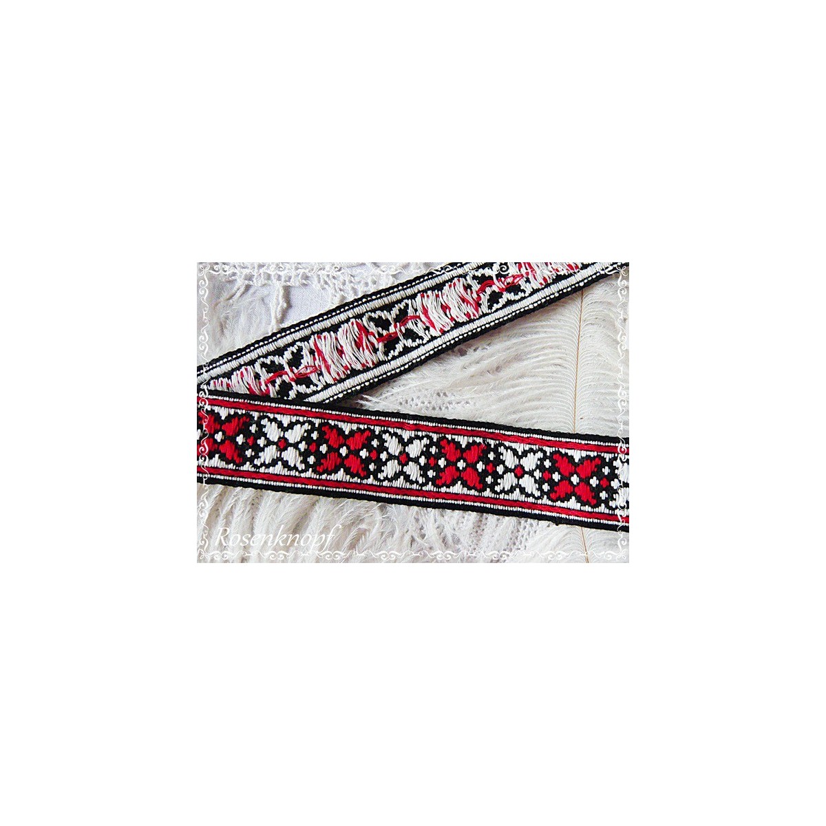 2,4 Meter feste Stoff- Webborte in Schwarz, Weiß und Rot mit floralem Muster.