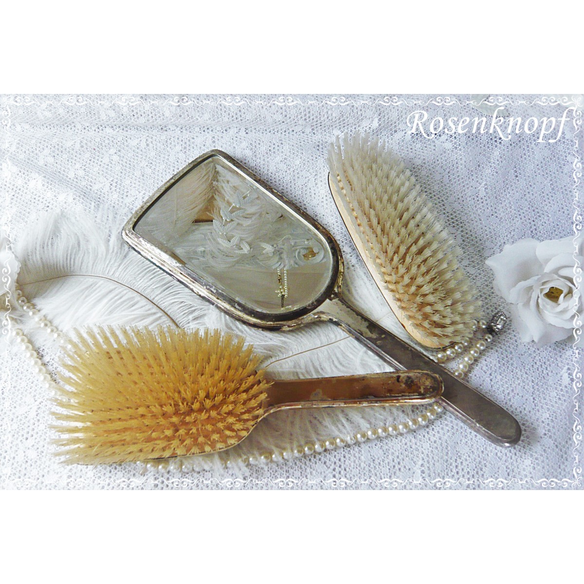 Das Frisierset besteht aus einem Handspiegel, einer Haarbürste und einer Kleiderbürste mit versilberter, strukturierter Oberfläche.