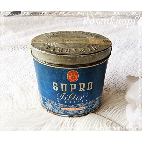Sie wurde aus Weißblech gefertigt und hat im Deckel die Prägung "Supra Filter Virginia" und die aufgeklebte Preisbanderole.