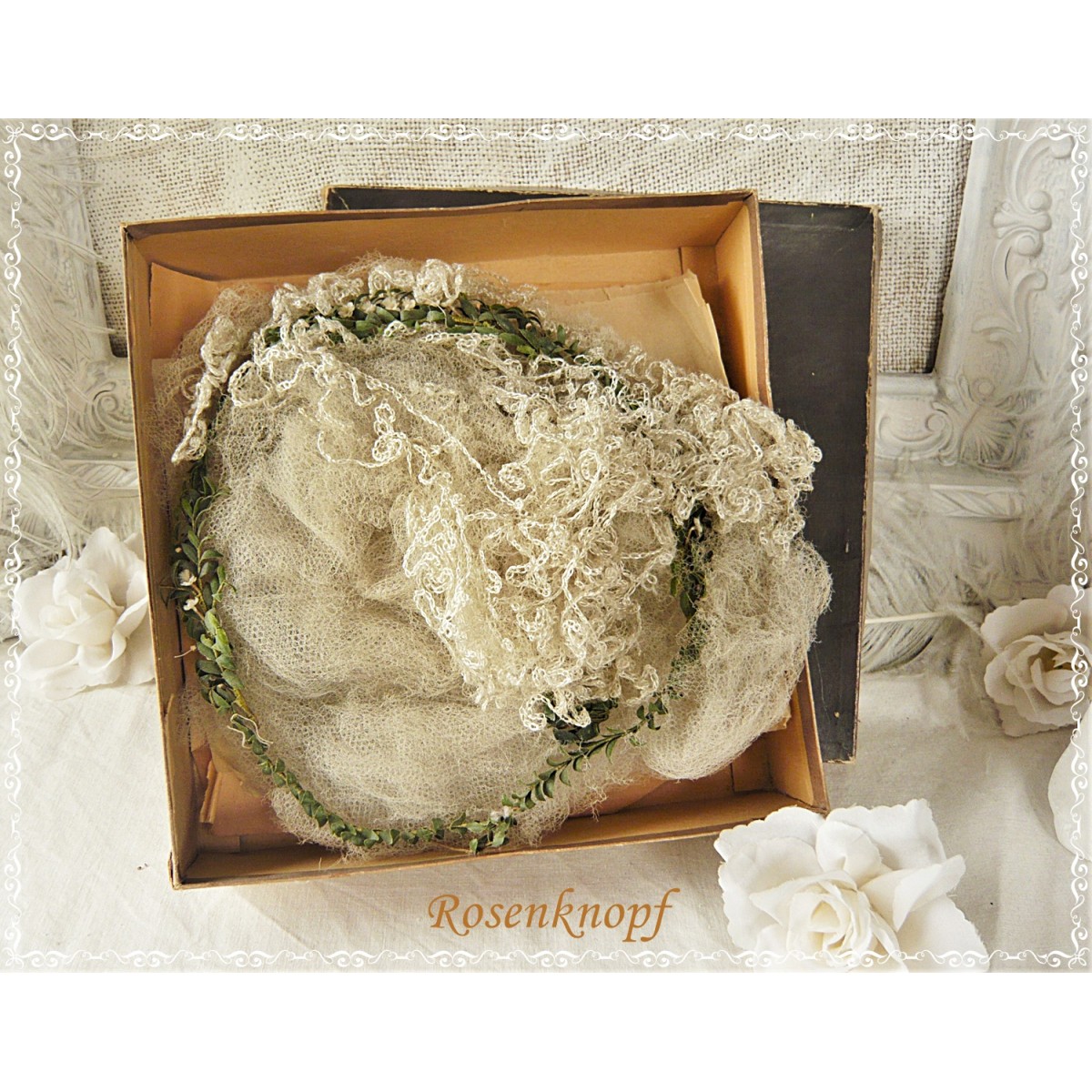 Mit dabei ist auch der damals typischem, künstlichen Myrtenkranz in Grün mit kleinen Blüten in Ivory, der über dem Schleier auf dem Kopf getragen wurde um diesen festzuhalten.