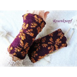 lll➤ Armstulpen, Pulswärmer aus Walk in Bordeaux mit floralem Muster in Ocker/Rehbraun. Die Walkstulpen ziert vorne wellig versäumte Bögen und eine Walkrose. Beliebt als Geschenk zB. zum Geburtstag, Ostern oder Weihnachten für Ihre Ehefrau, Freundin, Mama oder Schwiegermama, Schwester, Schwägerin, Oma, Tochter, etc.