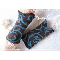 Kuschelweiche Walkstulpen für kühle Tage.♥ "Bych" wurden aus hochwertigem Relief-Walk in Dunkelbraun mit floralem Muster in Petrol-Blau genäht. Romantisch Akzente erhalten die Armstulpen durch die Klöppelspitze an der vorderen Kante. Die Stulpen enden in einer weichen Welle.