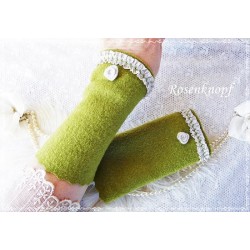 lll➤ Armstulpen, Pulswärmer aus Walk in Moosgrün. Die Damenstulpen ziert die leicht fransige Webkante mit floralen Zierstich und ein roter Knopf. Walkstulpen sind ein beliebtes Geschenk zum Geburtstag, Ostern oder Weihnachten für Ihre Ehefrau, Freundin, Mama, Oma, Tochter oder Schwester etc.