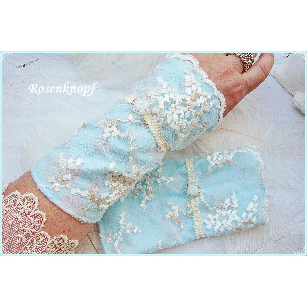 lll➤ Armstulpen/Pulswärmer aus Stoff und Tüll in Hellblau und Ivory zu einer Hochzeit, Standesamt, Fest.