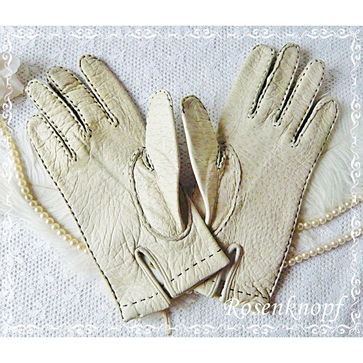 Wunderschönes Paar Vintage Handschuhe aus feinem Wildschwein-Leder in hellem Beige aus den 1950-1960ger Jahren in Größe 71/2 (Etikett inseitig).