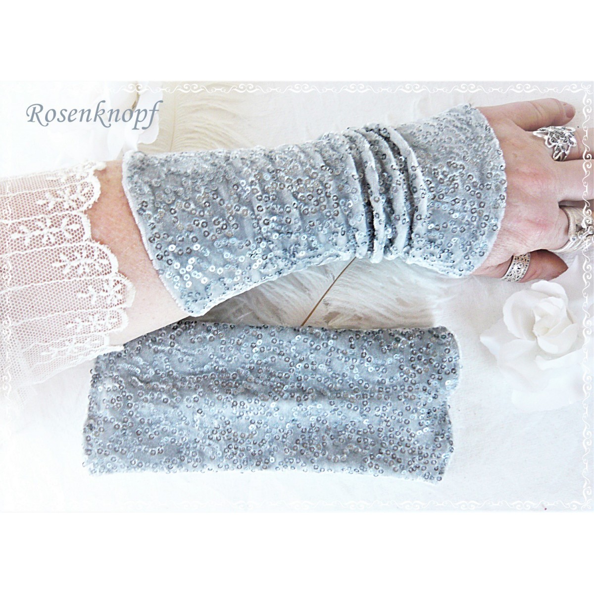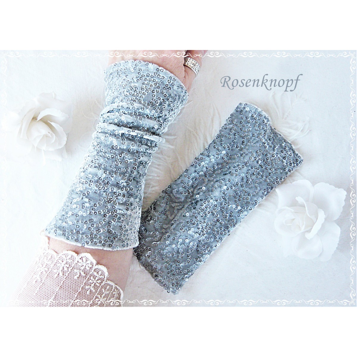 lll➤ Armstulpen/Pulswärmer in Silbergrau für eine Hochzeit, Standesamt oder ein Fest aus elastischem Stoff der üppig mit schimmernden Pailletten bestickt ist.