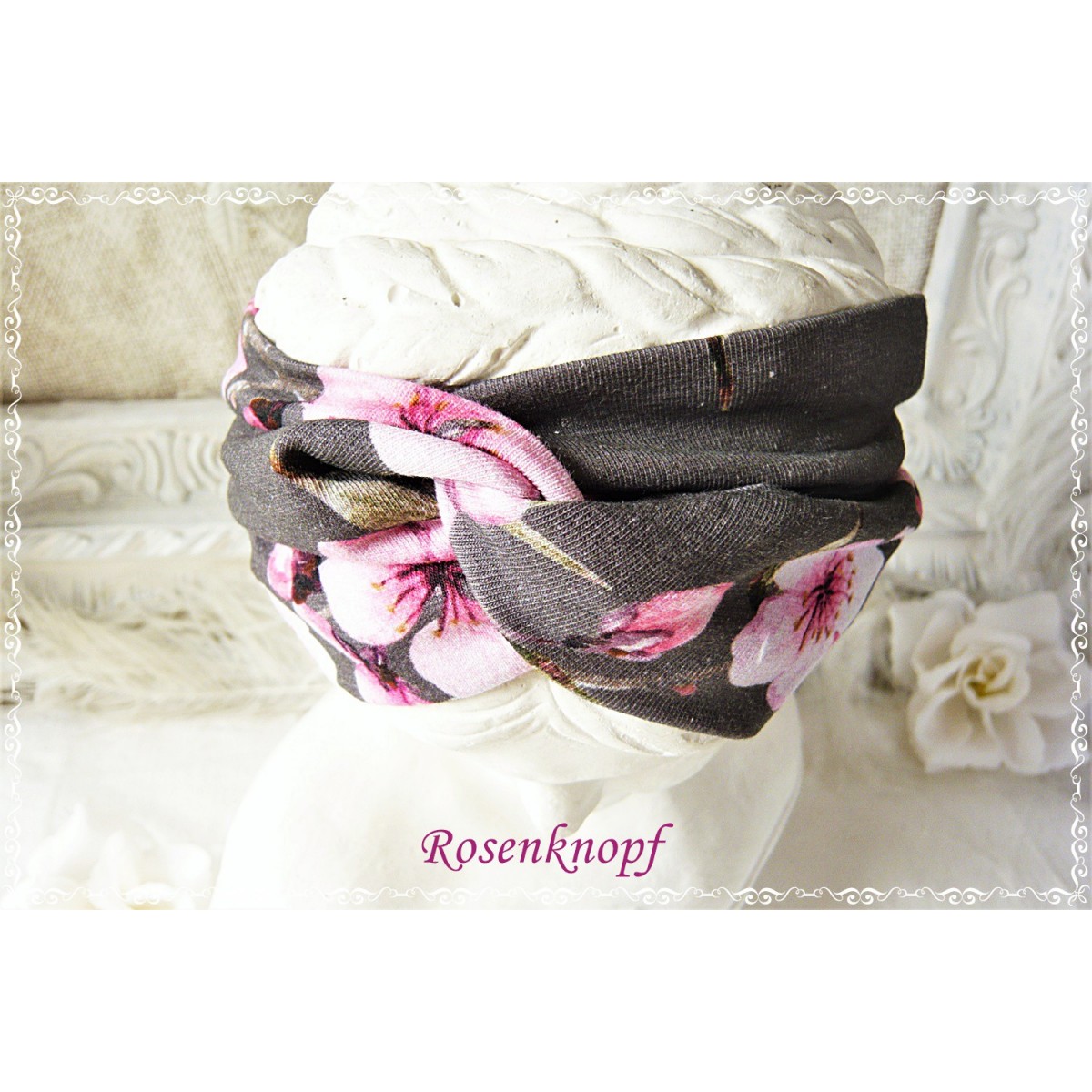 Zeitloses Stirnband aus elastischem Jersey in dunklem Grau und ansprechendem Kirschblüten Muster in Rosa und Ivory.