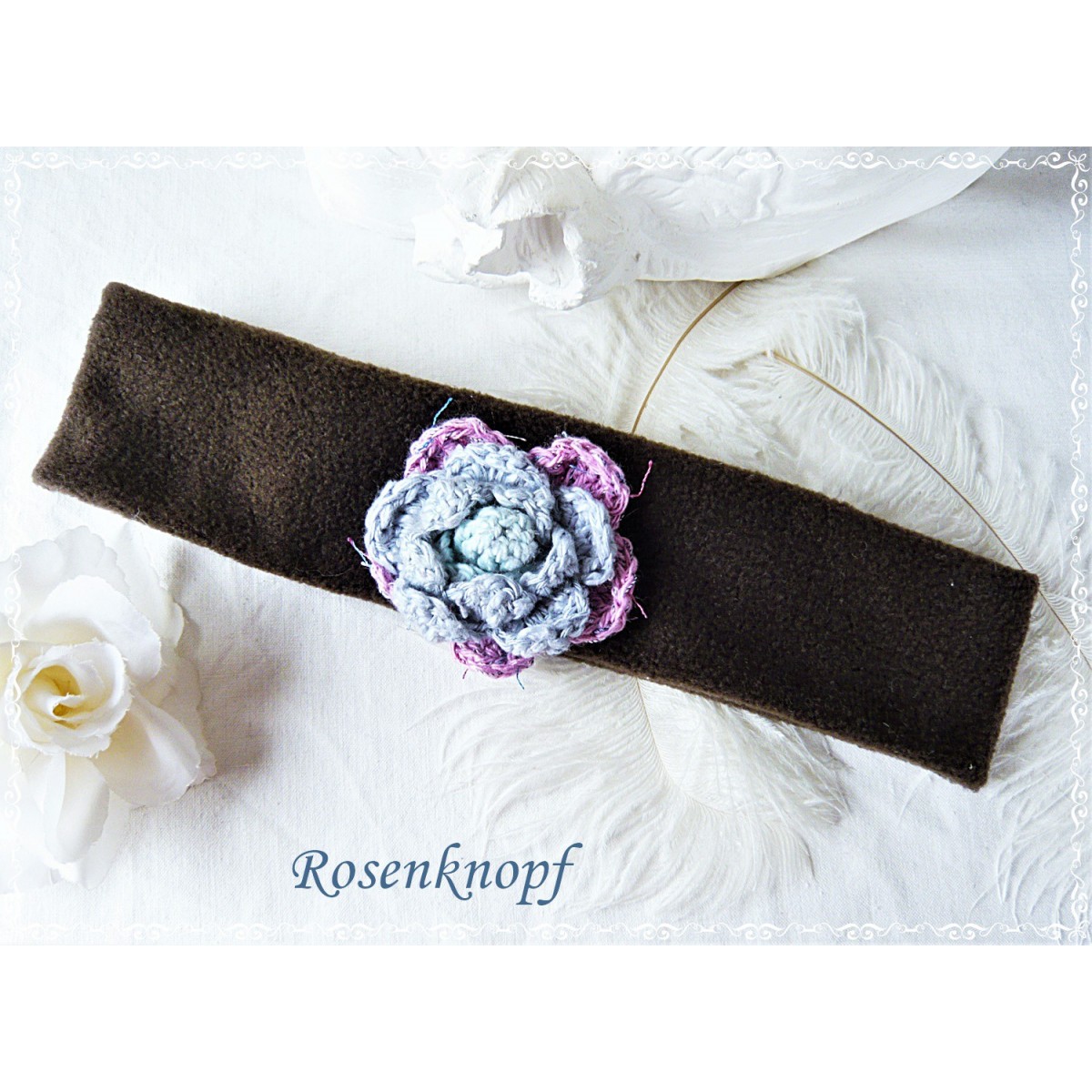 Zeitloses Stirnband aus elastischem Fleece in Dunkelbraun mit schmucker Blume.