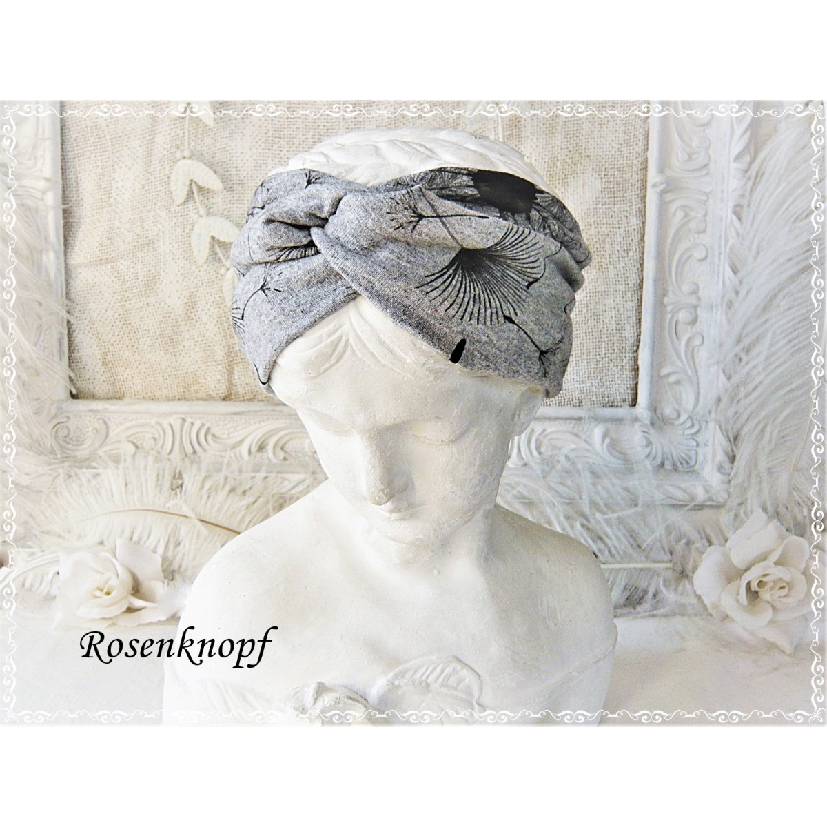 Zeitloses Stirnband aus Stretchstoff in hellem Grau mit stilisierten Pusteblumen in Schwarz.