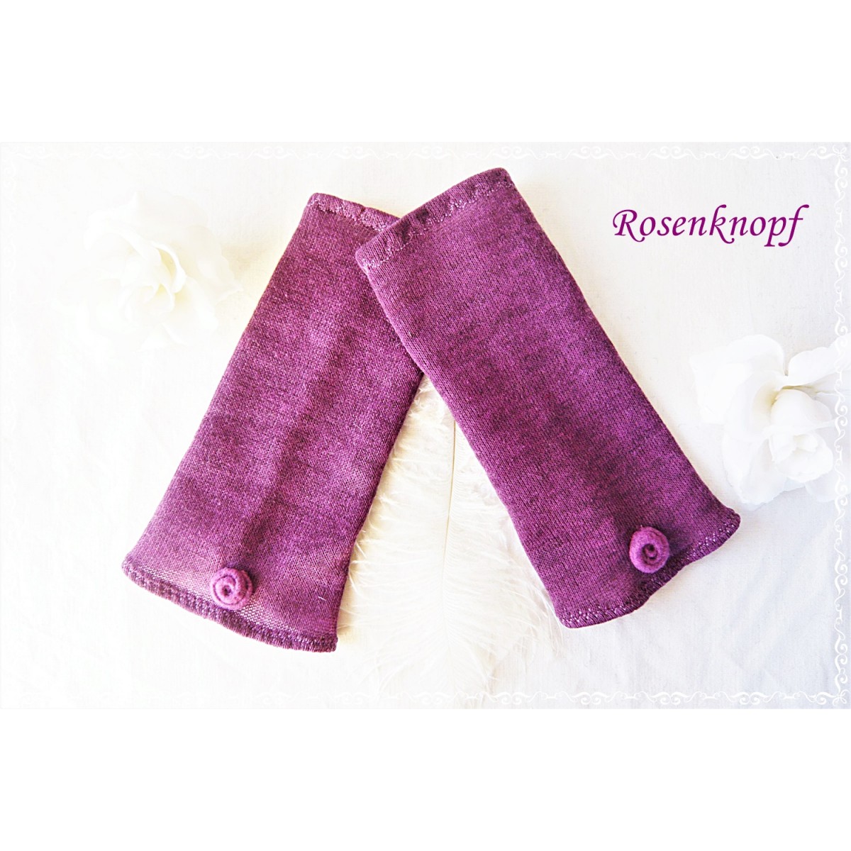 lll➤ Armstulpen/Pulswärmer aus bequemem Baumwollsweat in Violett mit kleiner Satinrose in dunklem Altrosa.