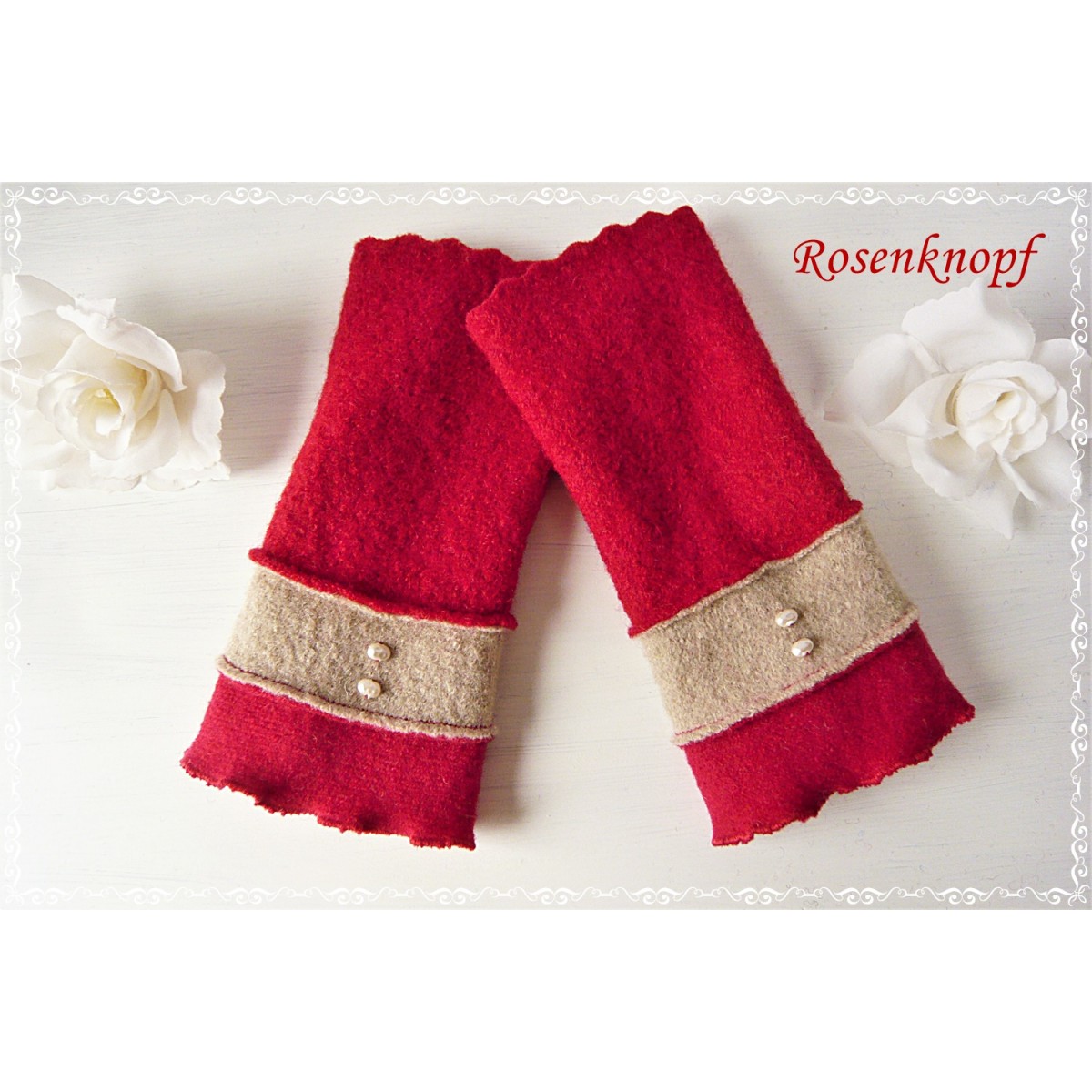 lll➤ Armstulpen/Pulswärmer aus Walk in Rot und Sand zu einer Hochzeit, Standesamt oder ein Fest.