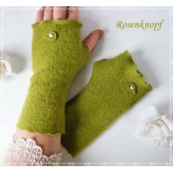lll➤ Armstulpen, Pulswärmer mit Daumenloch aus Walk in Hellgrün zur Hochzeit, Standesamt, Fest.Die Damenstulpen haben eine wellig versäumte Kante, Akzente setzt ein Walkblatt mit Perle in Ivory. Bitte schauen Sie jetzt hier: https://rosenknopf.de/damenmode/79258202-armstulpen-daumenloch-walk-s-m-l-viele-farben-pulswaermer-.html