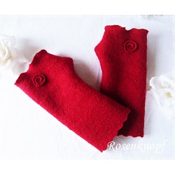 ♥Elegante Walkstulpen mit Daumenloch für kühle Tage♥ "ROSEDE" wurden aus hochwertigem Woll-Walk in Kirschrot genäht. Romantische Akzente erhalten die Armstulpen durch die wellig versäumten Kante vorne und der kleinen, von mir in Handarbeit gefertigten Walkrose. Die Stulpen enden in einer weichen Welle.