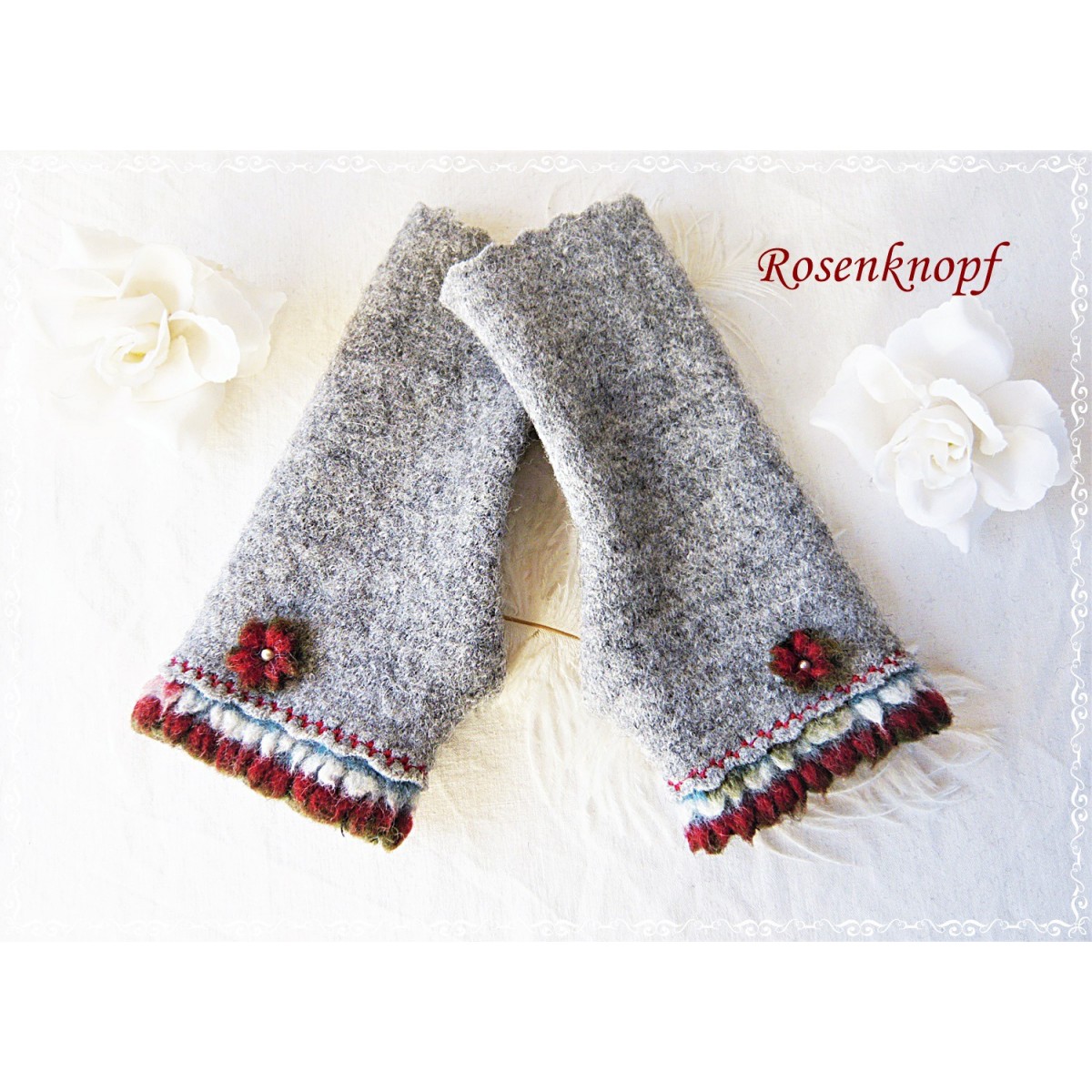 Akzente erhalten die Armstulpen durch die angesetzte Walkwebkante mit seinem leicht fransigen Aussehen in Rot und die von mir gefertigte Walkblüte in Rot.