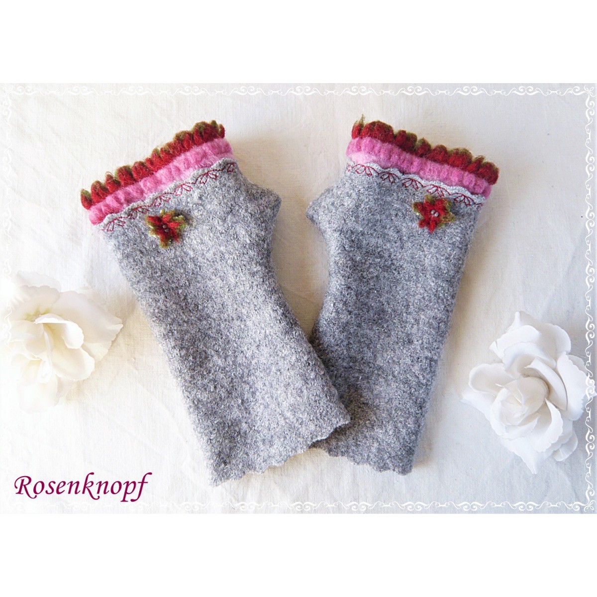 Akzente erhalten die Armstulpen durch die fransige Walk-Webkante in Rosa, Rot und Grün und die von mir gefertigte Walkblüte in Rot.