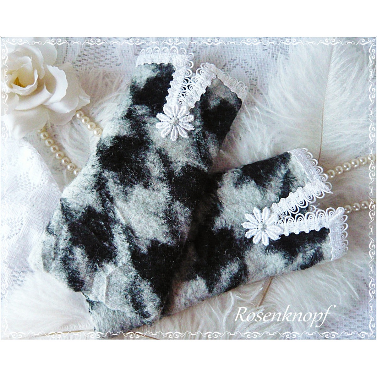 lll➤ Armstulpen/Pulswärmer aus Walk in schwarz-weißem Hahnentritt Muster zu einer Hochzeit, Standesamt, Fest.