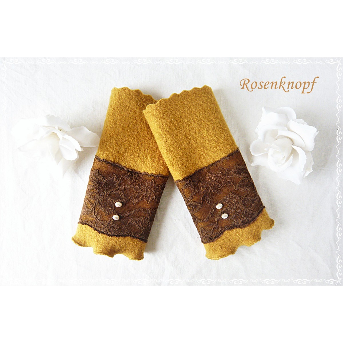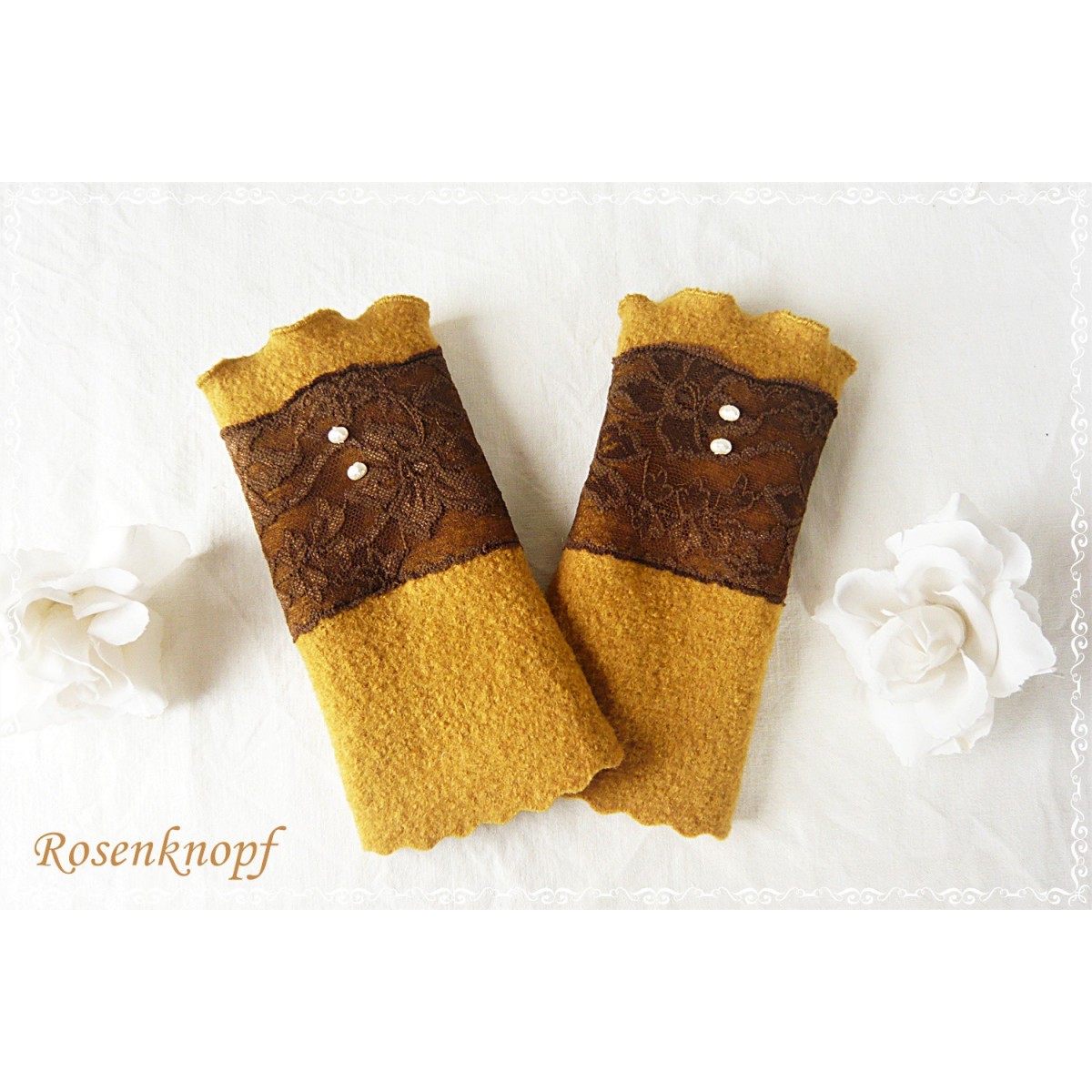 lll➤ Armstulpen, Pulswärmer aus Walk in Ocker/Curry zur Hochzeit, Standesamt oder ein Fest.