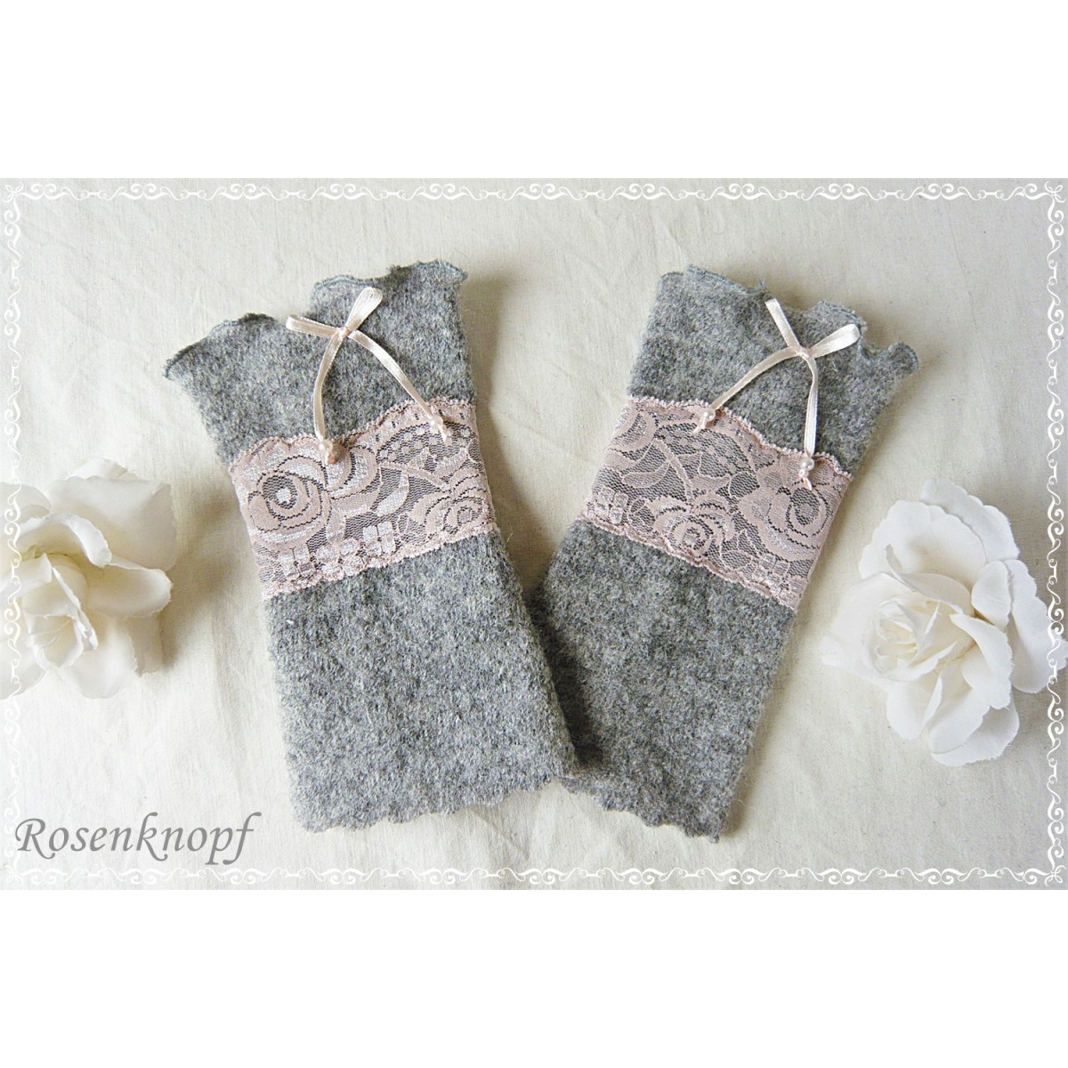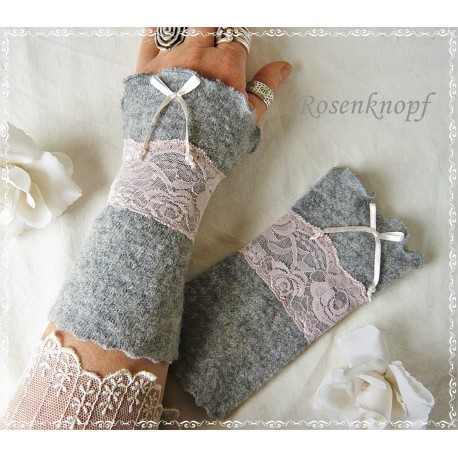 Romantische Walkstulpen in Grau mit elastischer Spitze in zartem Rosa mit floralem Muster und Satinschleifchen mit kleinen Perlen.