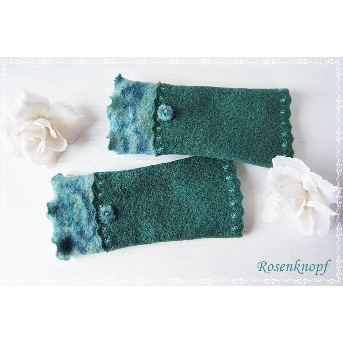 Die Stulpen ziert die wellig versäumte Kante und ein Walkblümchen mit Perle.