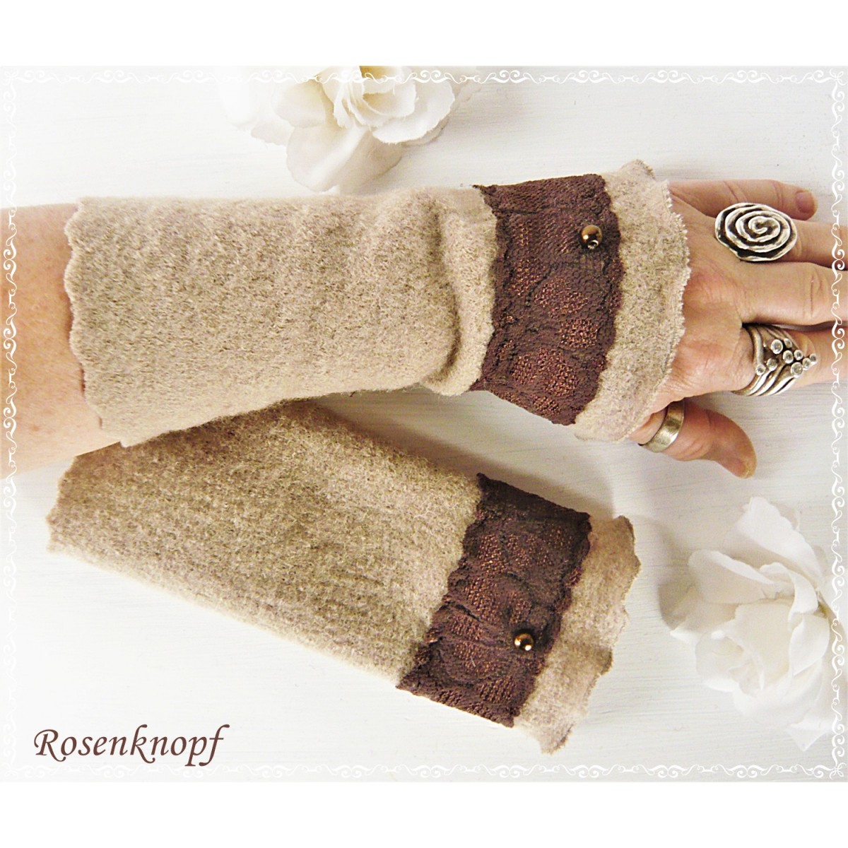Romantische Akzente erhalten die Armstulpen durch die elastische Spitze in Dunkelbraun.