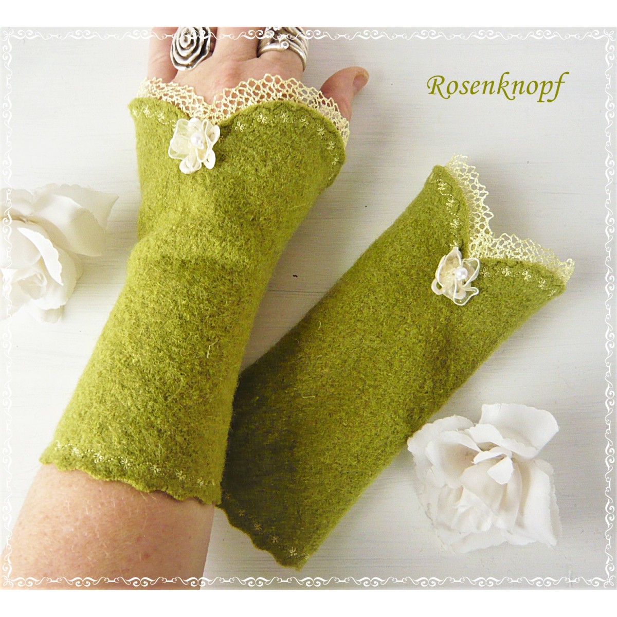 lll➤ Armstulpen, Pulswärmer aus Walk in Hellgrün zur Hochzeit, Standesamt oder ein Fest.