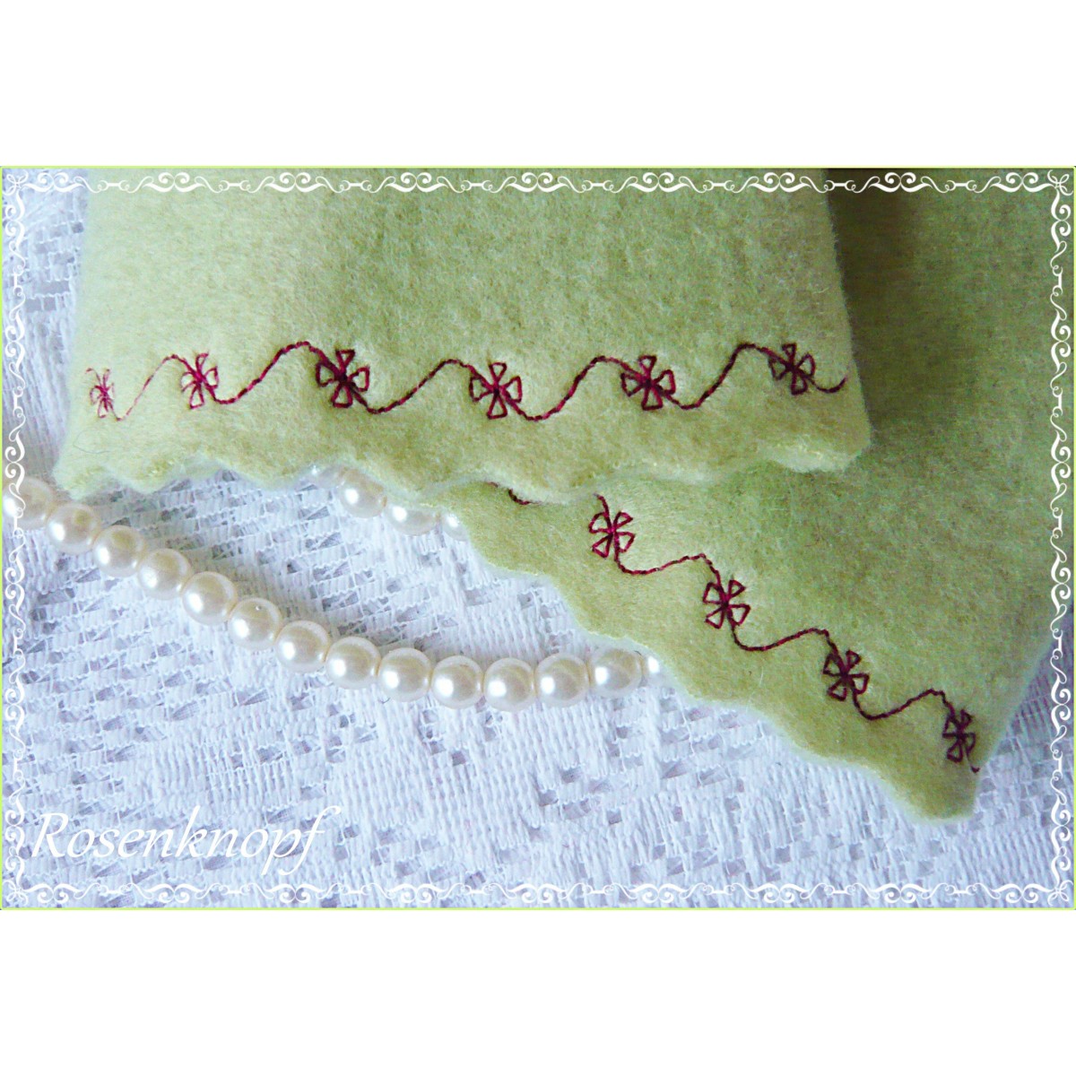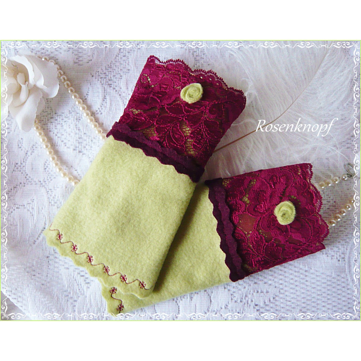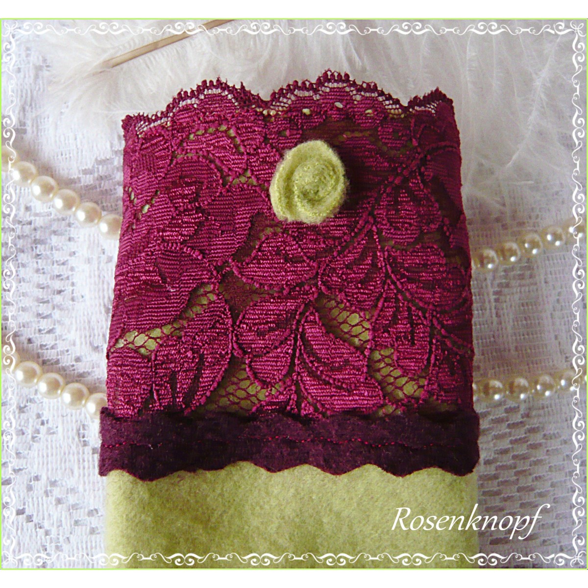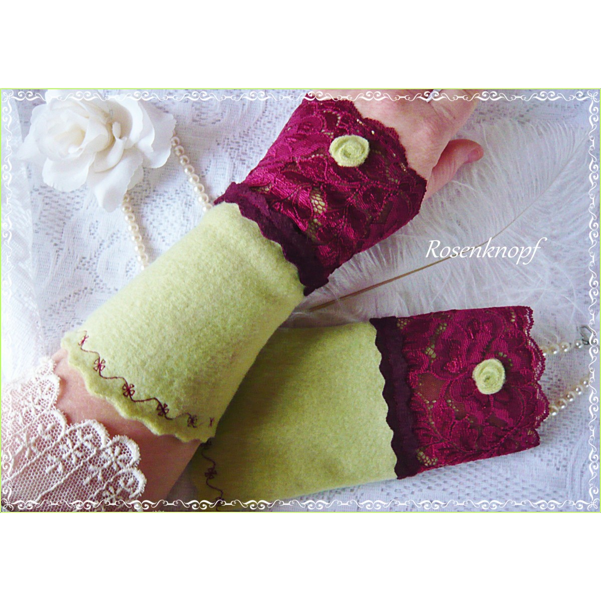 Romantische Akzente erhalten die Fleecestulpen durch zarte Fleeceröschen und die elastische Spitze in Bordeaux.