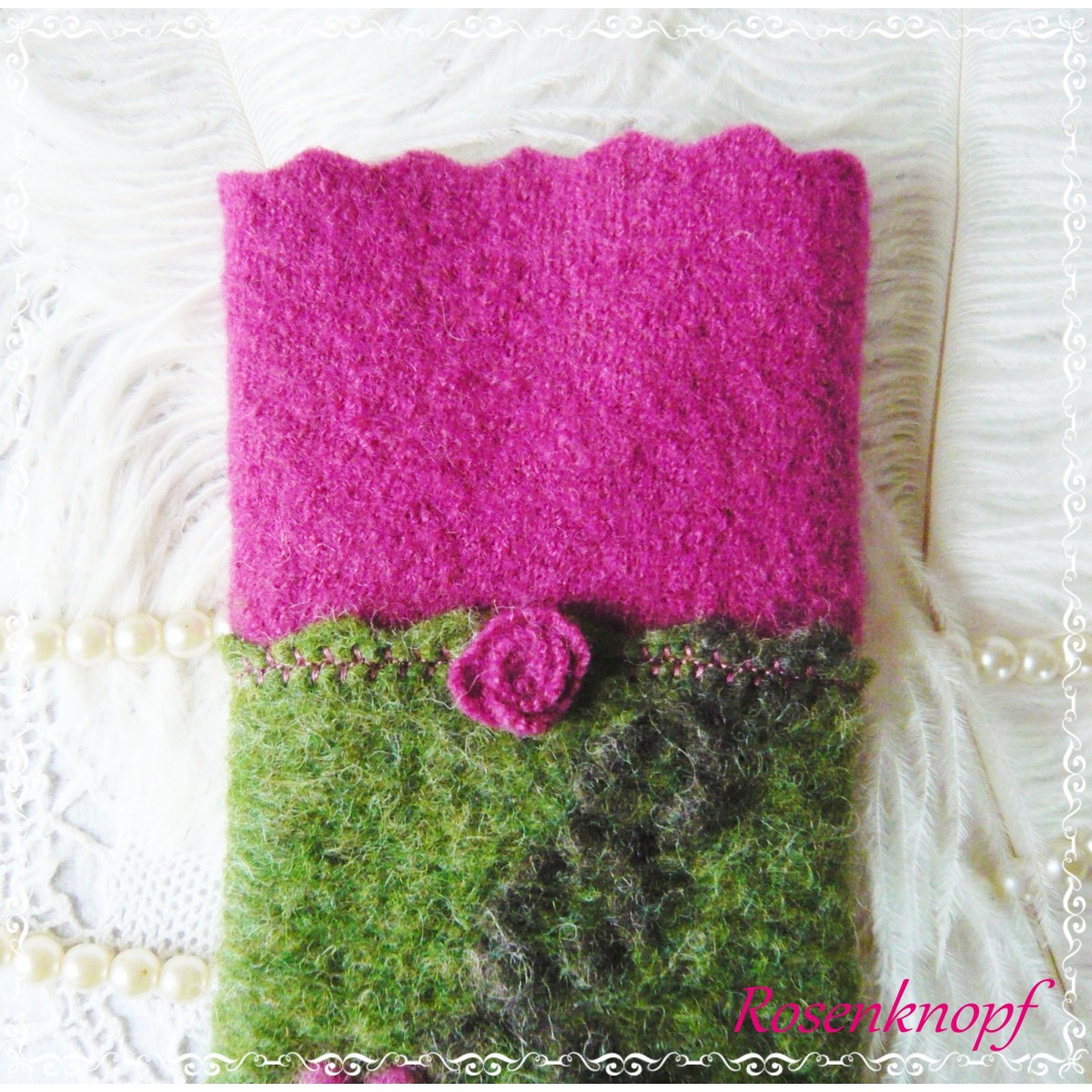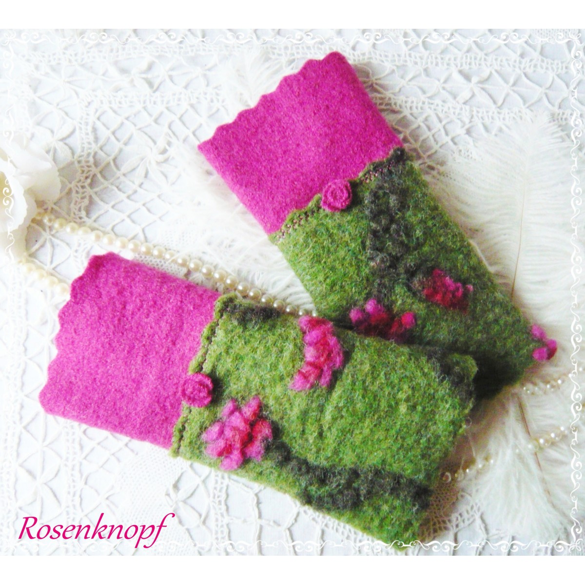 Romantische Akzente erhalten die Armstulpen durch das Walkröschen und den angesetzten Walkstreifen in Pink, der mit Zierstich an die vordere Kante angenäht wurde.