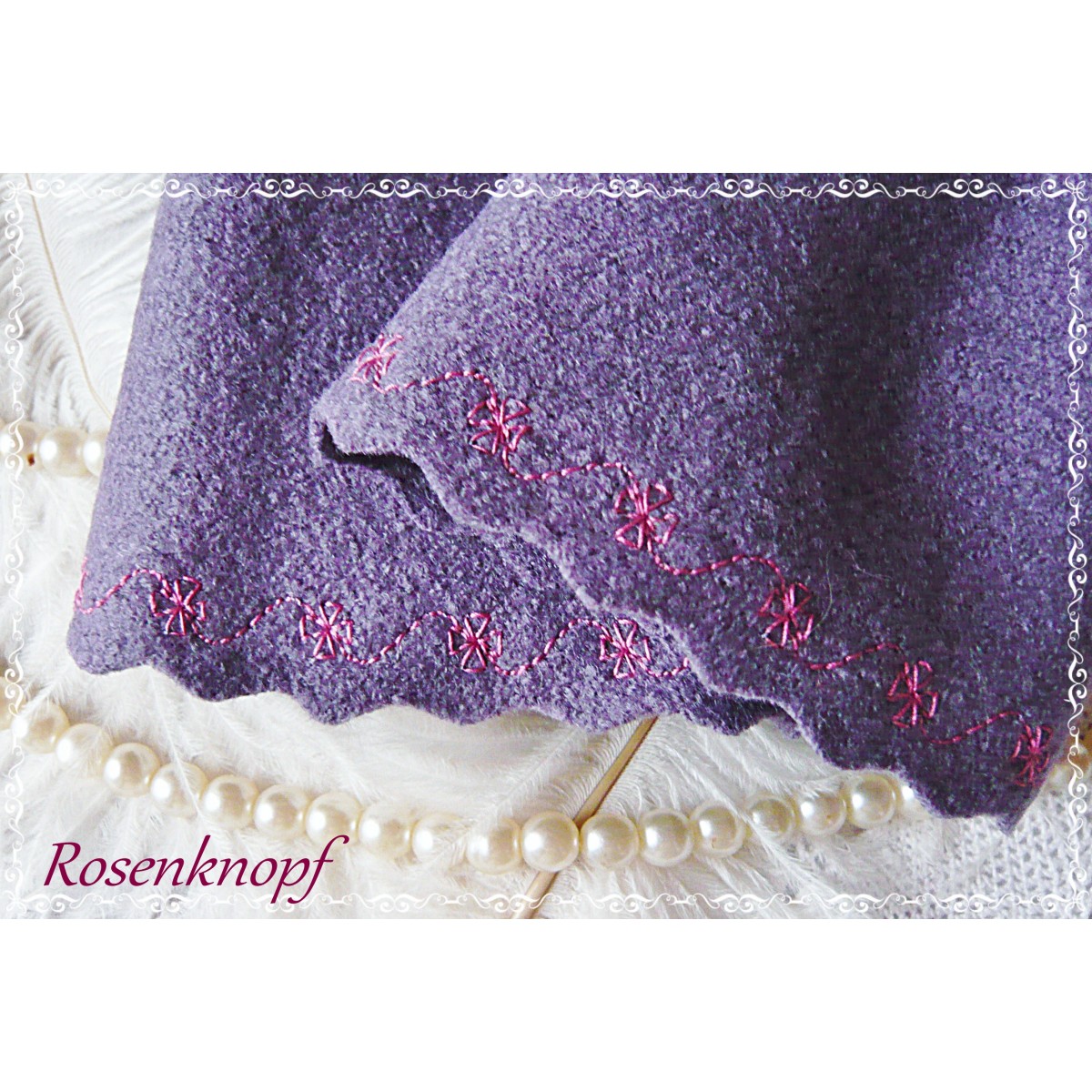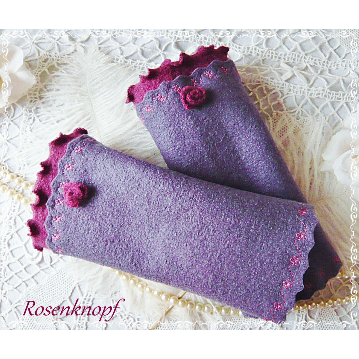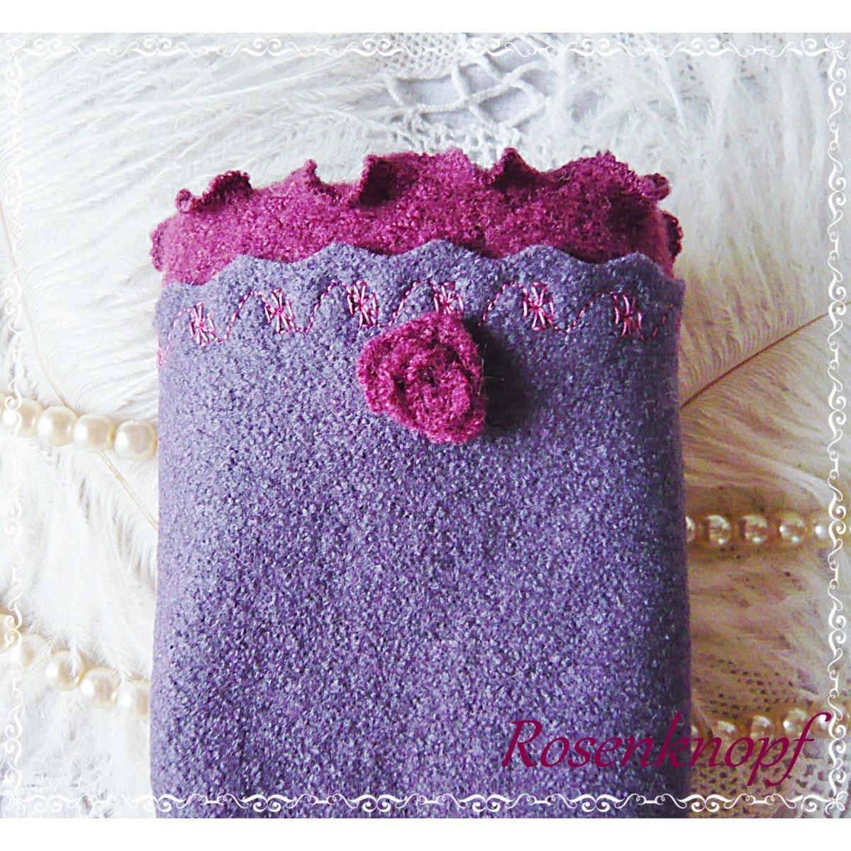 Romantische Akzente erhalten die Armstulpen durch das Walkröschen und den gekräuselte Walkstreifen in Violett, der mit Zierstich an die vordere Kante angenäht wurde.