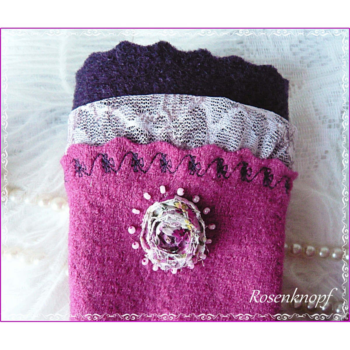 Auberginefarbener Walk und feiner, zart fliederfarbener Tüll wurden mit floralen Zierstich an die Stulpen genäht und heben die vorderen, gewellten Kanten hervor.