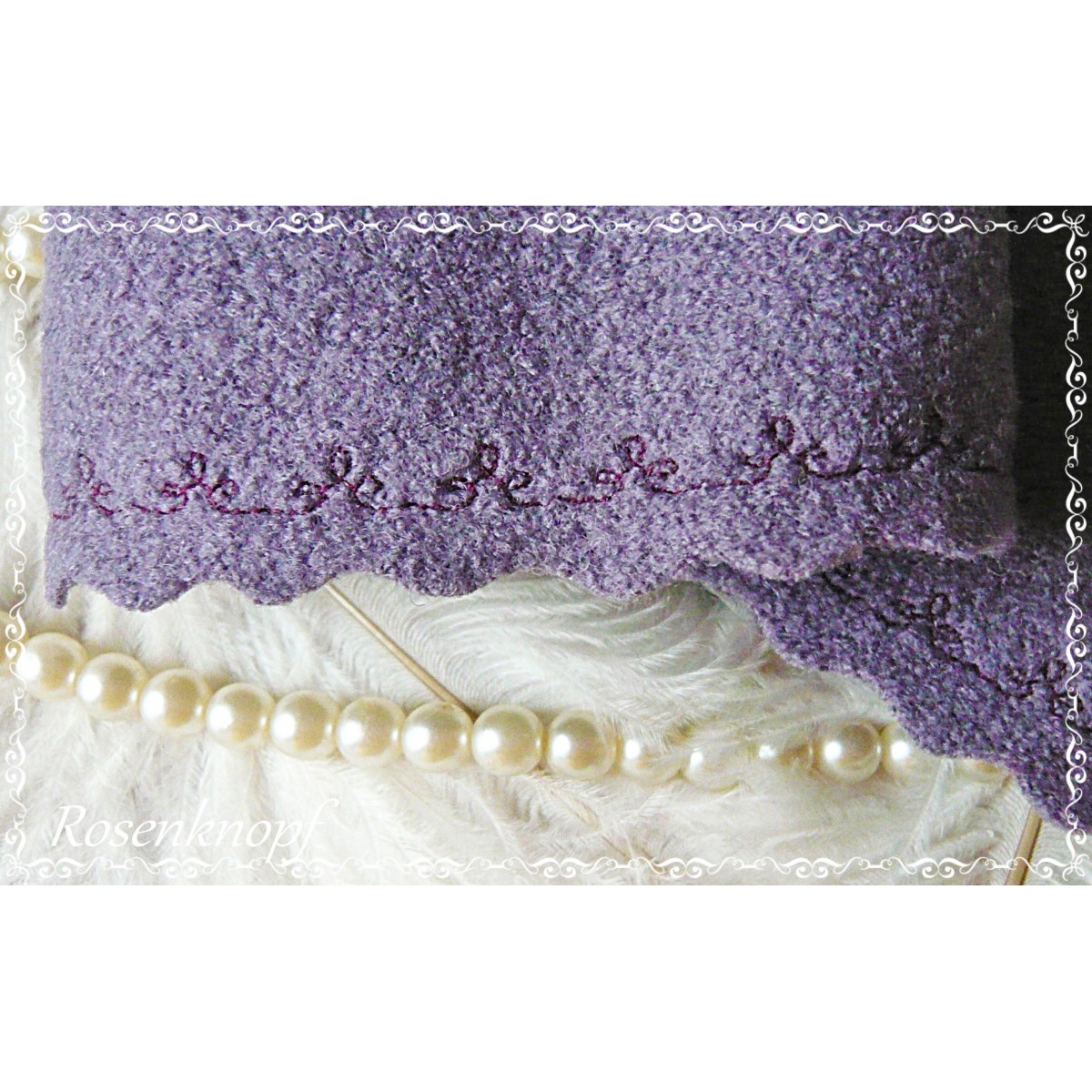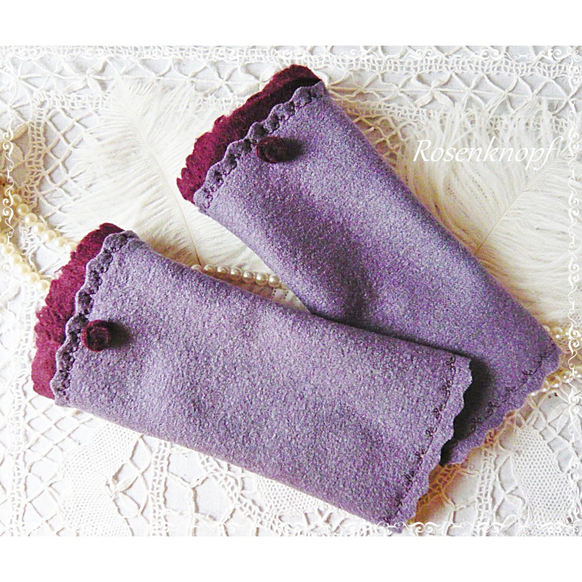 Romantische Akzente erhalten die Armstulpen durch den bordeauxfarbenen Walkabschluss, das Walkröschen und Ziernähte.