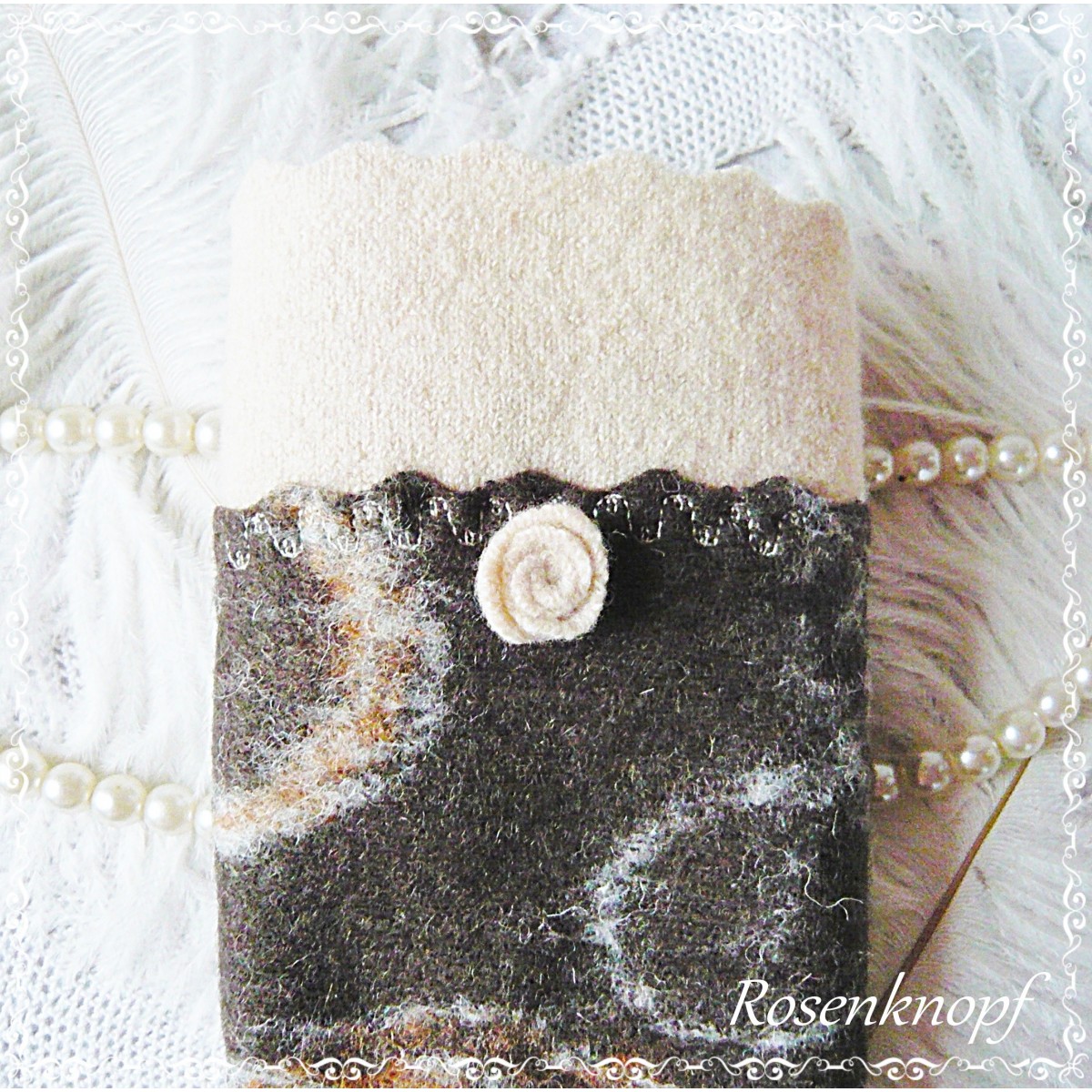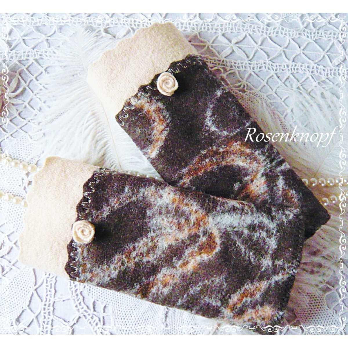 Romantische Akzente erhalten die Armstulpen durch den Walkstreifen in Beige, das Walkröschen und die Ziernaht.