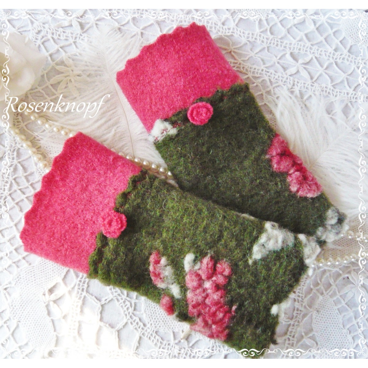 Romantische Akzente erhalten die Armstulpen durch das Walkröschen, den Walkstreifen in Hummerrot und einen Zierstich.