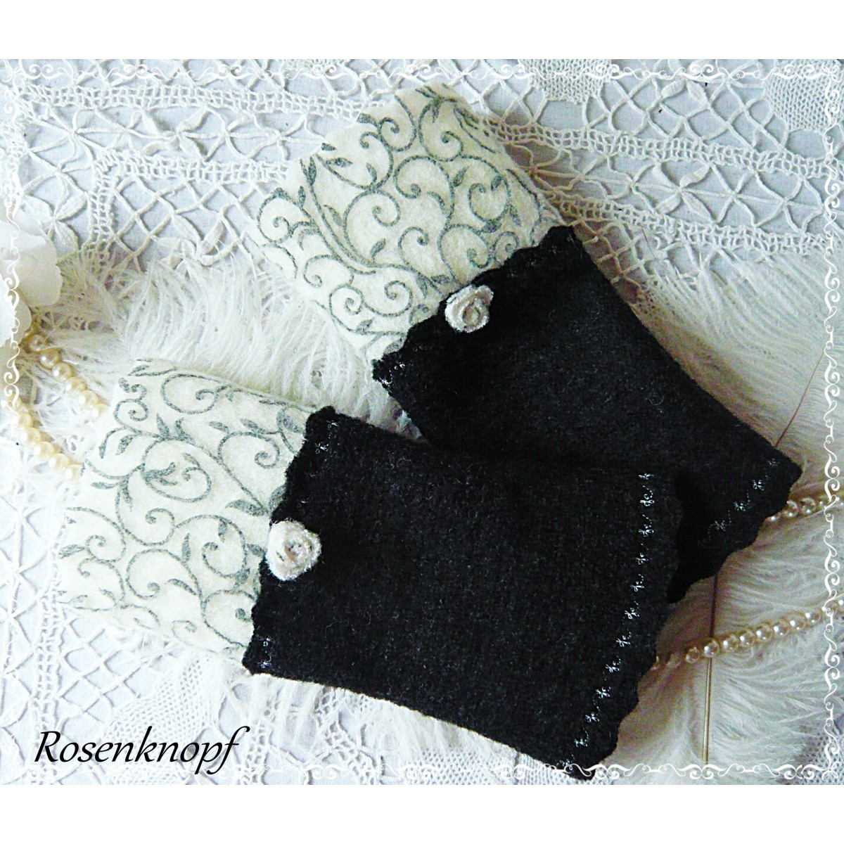 Romantische Akzente erhalten die Armstulpen durch den angesetzten Walk in Weiß mit floralen Ranken, das Walkröschen und florale Ziernähte.