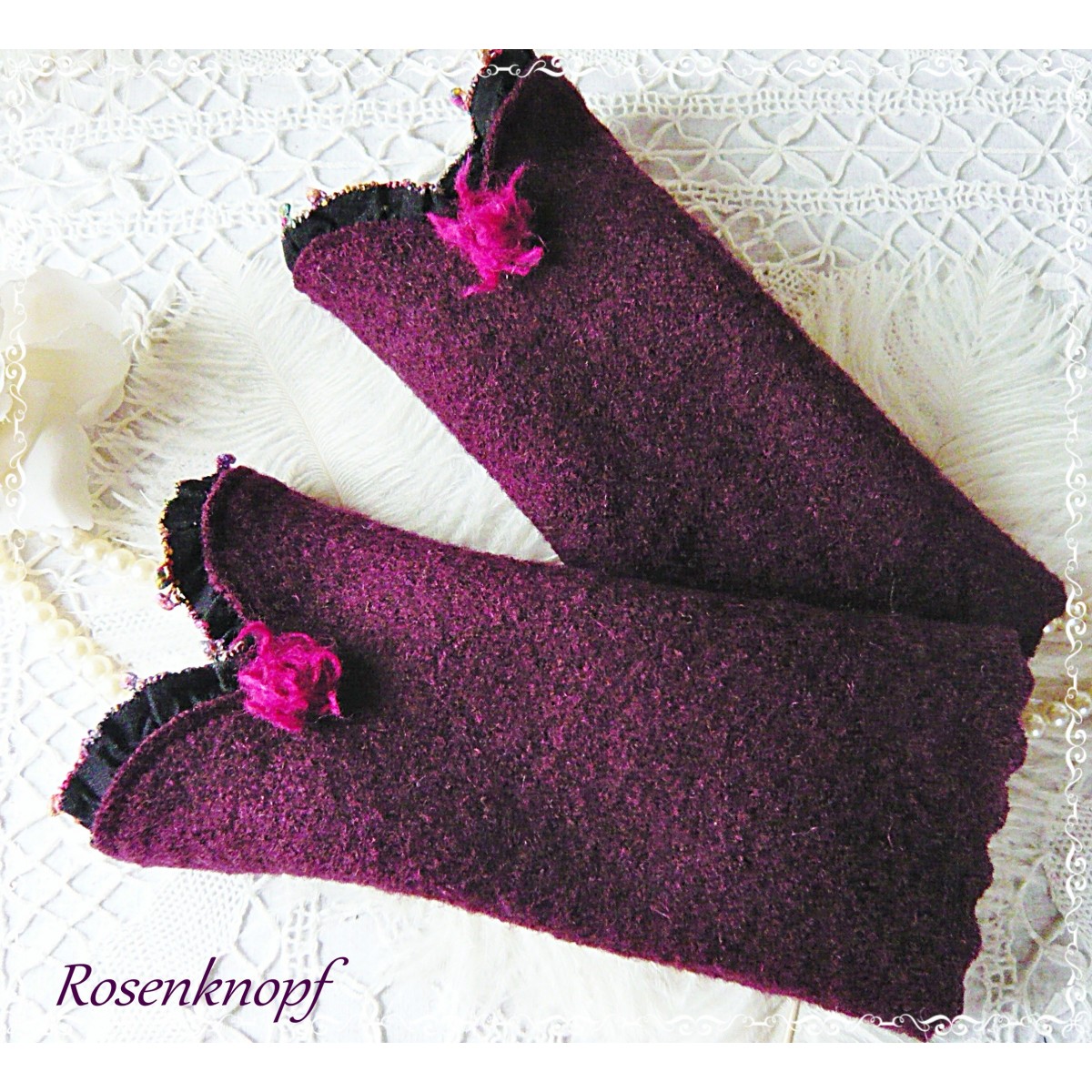 Romantische Akzente erhalten die Armstulpen durch die fransige Walkblüte in Pink und die schwarze Stoffborte mit farbigen Garnknötchen am vorderen Bogenabschluss.