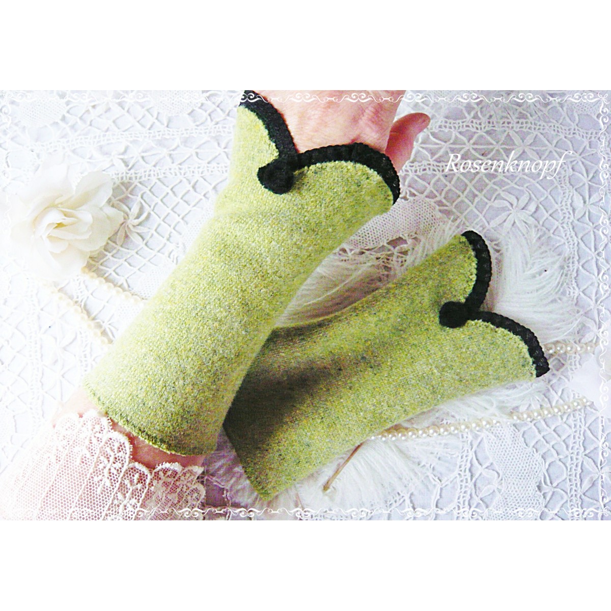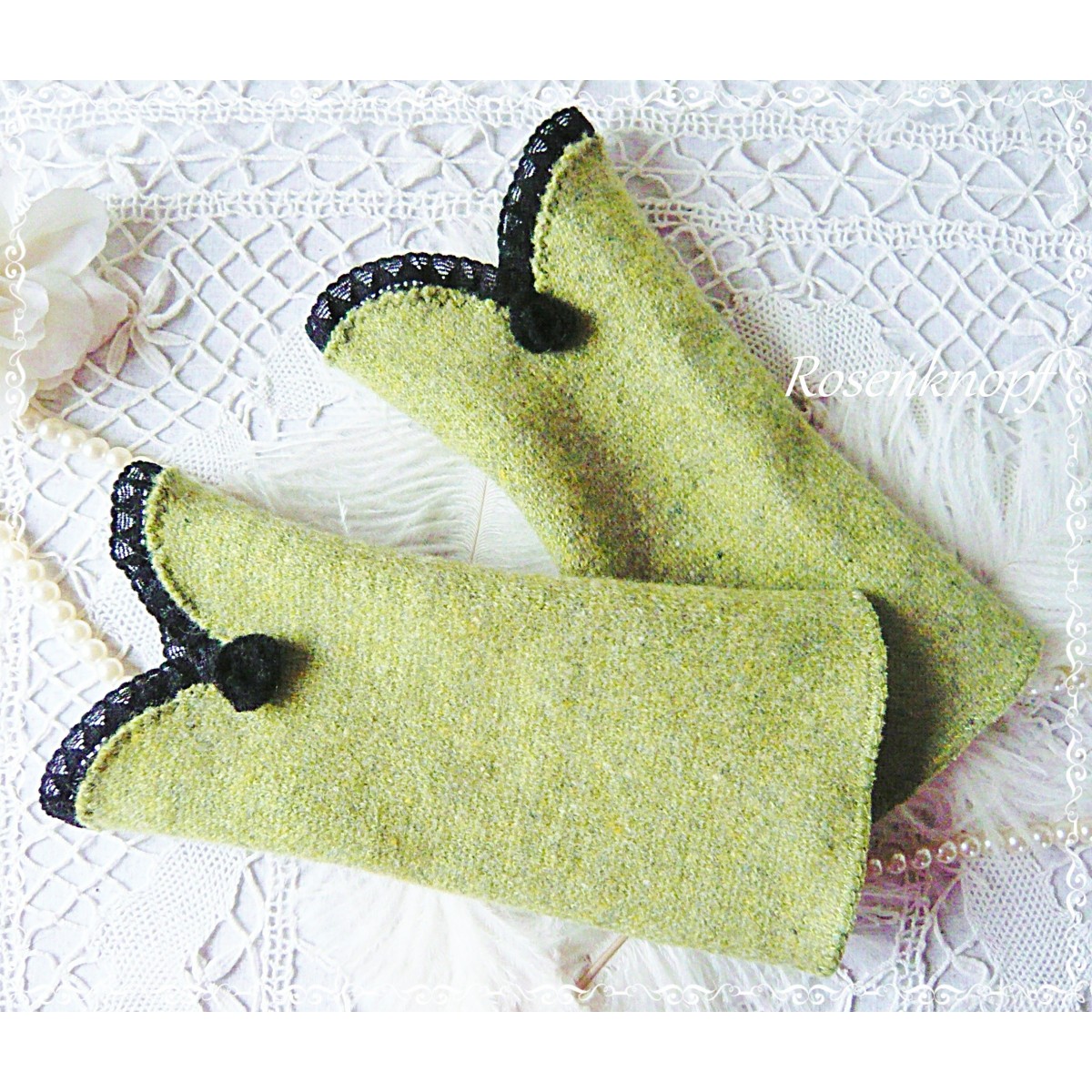 Romantische Akzente erhalten die Stulpen durch das Walkröschen und die mit schwarzer Spitze verzierten, weich abgerundeten Kanten.