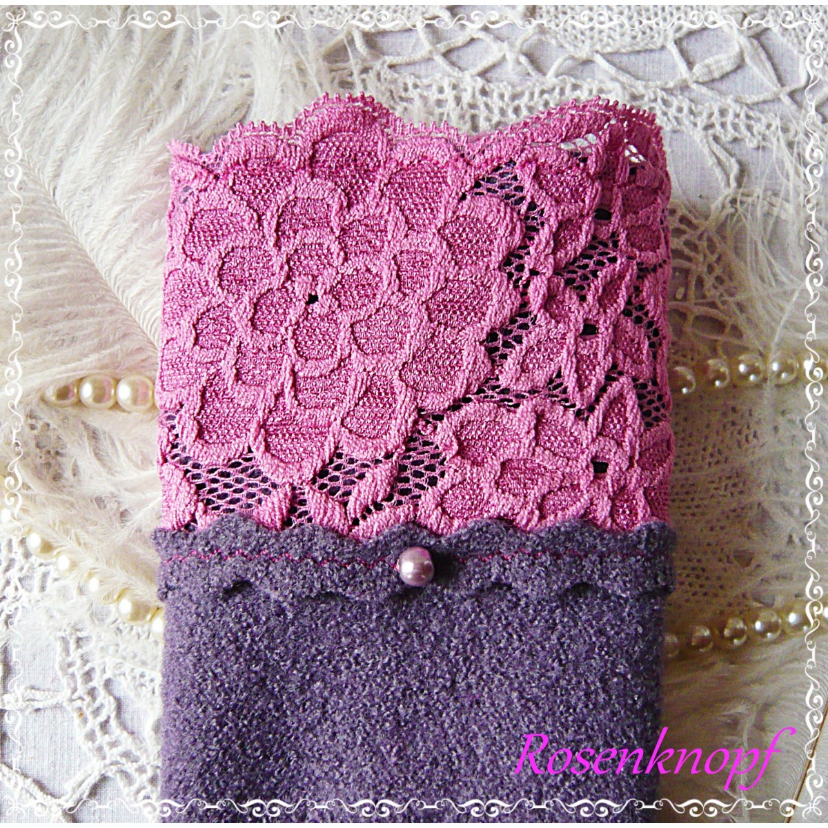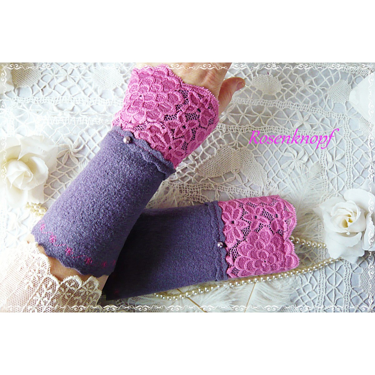 Romantische Akzente erhalten die Armstulpen durch die floral gemusterte Spitze in Pink und eine rosafarbene Perle.