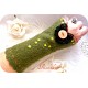 Verspielte Akzente erhalten die Stulpen durch die schwarze Spitzenrosette mit Knopf, grasgrüne Pailletten und Rocailles und die rehbraune Tüllborte an den weich abgerundeten Kanten.