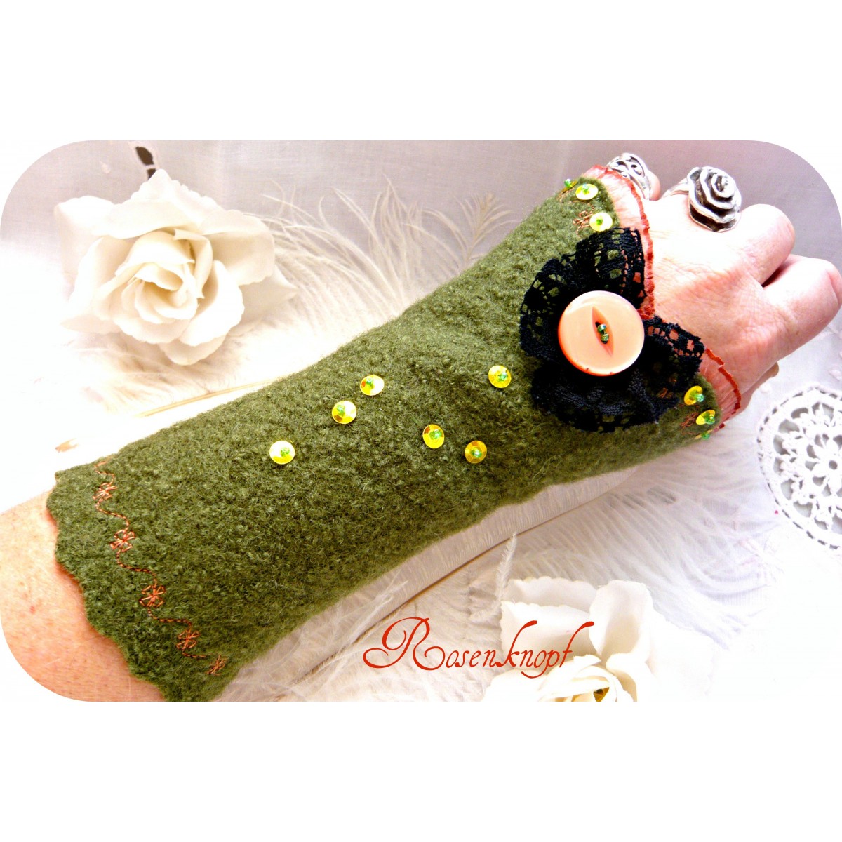 Verspielte Akzente erhalten diese einzigartigen Stulpen durch die schwarze Spitzenrosette mit Knopf, grasgrüne Pailletten und Rocailles und die rehbraune Tüllborte an den weich abgerundeten Kanten.