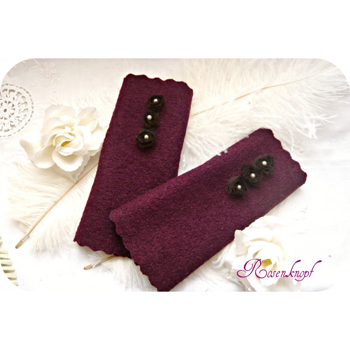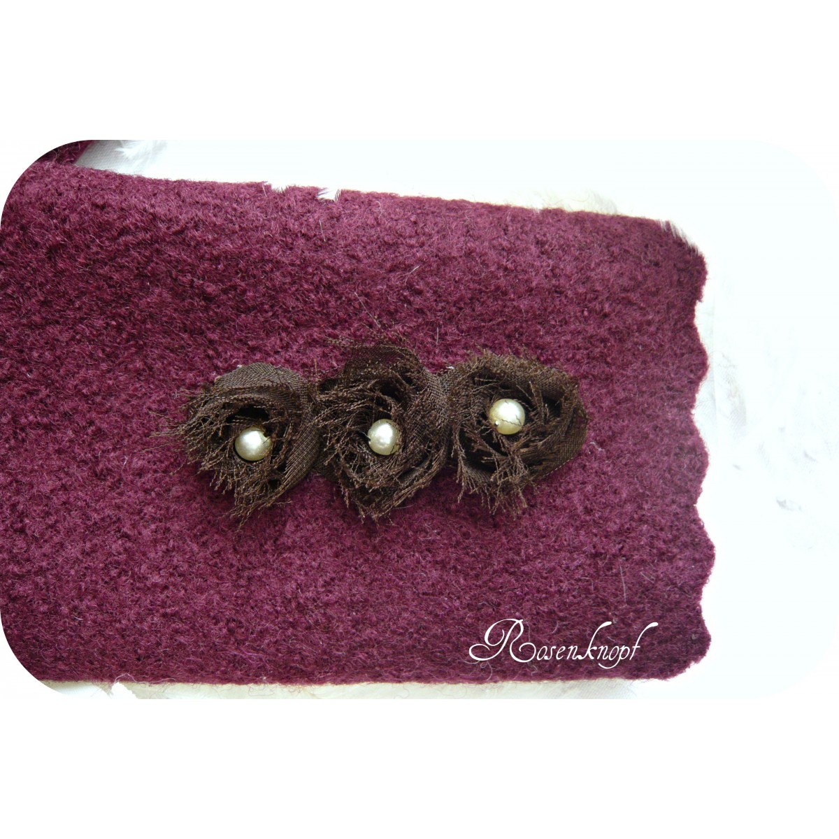 Romantische Akzente erhalten die Wollstulpen durch drei aneinandergereihte braune Tüllröschen mit Wachsperlen in der Mitte.
